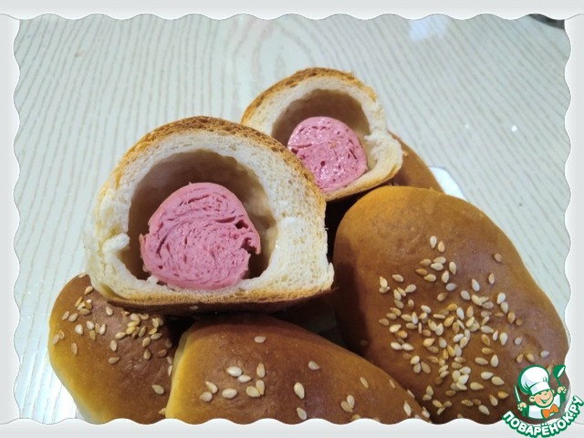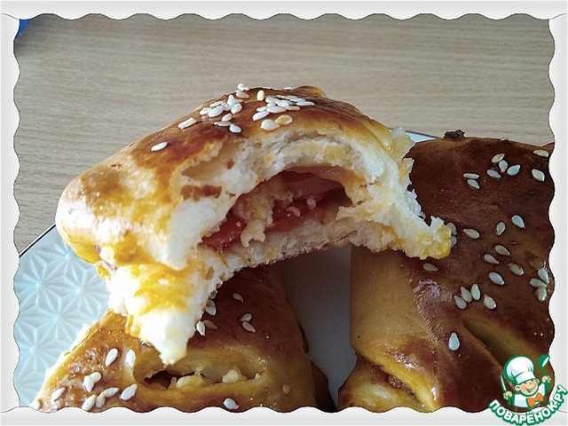 Родные попросили приготовить пиццу. Рецепт не пришлось долго искать. В тесто муки ушло поменьше (380 г), остальное по рецепту. Тесто замечательное, с ним было приятно работать. А вот дальше пришлось поволноваться. Все сделала по рецепту, но никак не хотело тесто между собой соединяться, сосиски так и норовили выскочить. Ну, думаю, теперь уж что получится. Выпекала 18 минут при 180 г. В итоге получились очень вкусные булочки. Для нас именно булочки с начинкой от пиццы. Вкусно, сытно. Для себя сделала вывод: края треугольников стараться не увлажнять кетчупом для лучшего скрепления теста и удобнее все же использовать кусочки колбасы покрупнее нарезкой. Обязательно буду повторять с учетом уже полученного опыта.