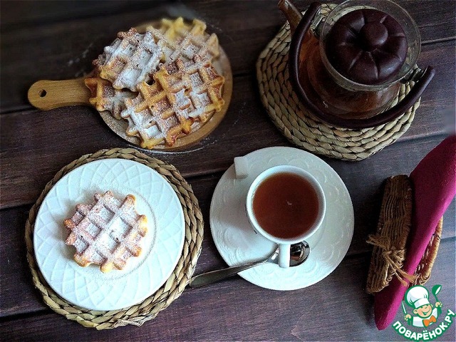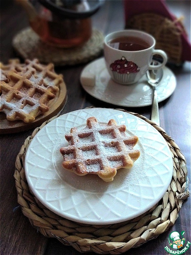Отличные вафли. Очень вкусные. Все сделано по рецепту. Если вам покажется не сладко, то добавьте сахар. Я просто присыпала готовые вафли сахарной пудрой. Спасибо большое за рецепт.