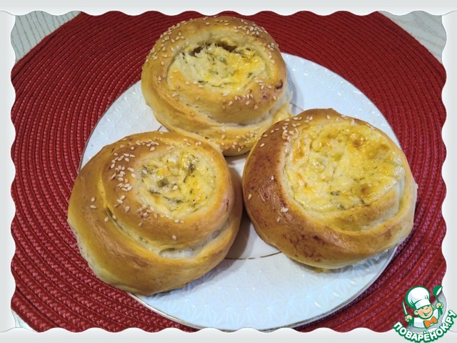 Наконец-то я воспользовалась рецептом. Тесто готовила точно по рецепту. Оно очень хорошо выросло и с ним легко было работать. У меня получилось 10 булочек приличного размера. Я каждый колобок сначала руками разминала до лепешки, вырезала формочкой круг, убирала его на противень, сверху – начинка и потом скручивала жгутик. Так для меня было удобнее, чем переносить готовое изделие. Так, практически без какого-либо участия с моей стороны, получились красивые завитушки в оформлении. Выпекала 30 минут при 180 градусах. Верх смазывала молоком. Ах, как же вкусно получилось!!! Начинка замечательная. У меня лука не хватило, я чуть добавила сухого укропа. Обязательно буду повторять!!!!