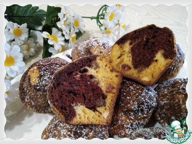 Готовила в маленьких формочках. Для удобства продукты взвешивала. Сахара ушло 240 г, муки 275 г, использовала лишь 1 ст.л какао. Выпекала 20 минут при 180 градусах. Получились вкусные кексики, которые так и хотели выпрыгнуть из форм. Для себя решила, что в следующий раз буду сразу добавлять какао в тесто, так как плотность двух видов теста получилась разная и неудобно было размешивать в формах. И еще положу побольше орехов вместо изюма.
