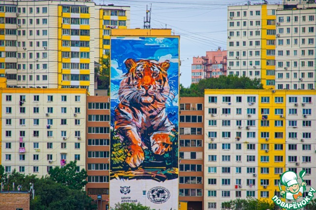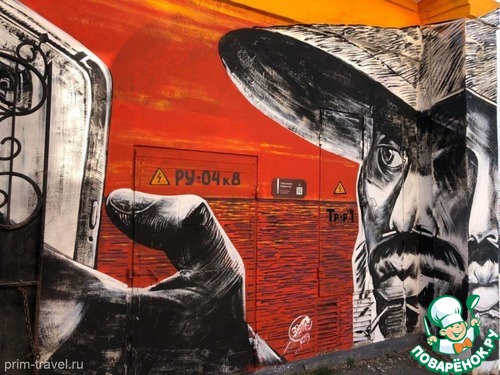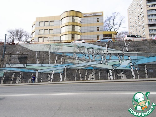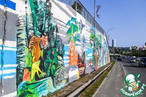 Владивосток – город многоуровневый, стоит на сопках, в нём много так называемых подпорных стен, и практически все они разукрашены и разрисованы. Но это не баловство подростков с баллончиками, а настоящие тематические рисунки. Жаль, что сфотографировать их не так-то просто – обычно мы проносимся мимо них на машине.