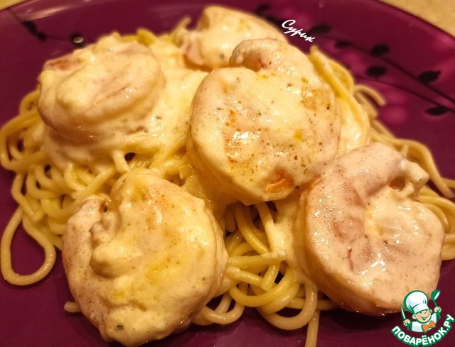 Очень и очень вкусно получилось! Сырно-сливочный соус! Супер! Но сыр я брала обычный - "Российский". Добавила еще французских травок. Отличные креветки!!!