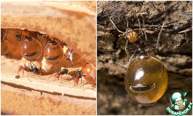 Медовые муравьи - особая группа крупных рабочих муравьёв. Наиболее распространённый вид медовых муравьев - Camponotus inflatus. В своих брюшках они хранят запасы жидкой углеводной пищи, полученной из нектара растений - это подобие мёда. Они отрыгивают его при необходимости другим муравьям из колонии, когда тем не хватает пропитания.