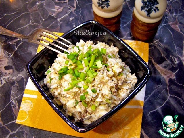 Салат привлек своим названием (орфография автора). Захотелось попробовать. Состав простой, я готовлю похожий салат, когда остается невостребованный отварной рис. Только добавляю соленый огурец, а иногда еще горошек или кукурузу. Попробовала и этот вариант: неплохо, но с добавками мне нравится больше.