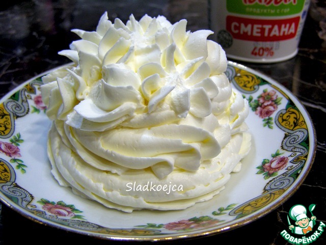 У меня сметана была жирная, поэтому отвешивать не понадобилось. Смешала её с пудрой и взбила миксером за 3 минуты. Получился вкусный крем, который отлично держит форму. Но, если сметана не очень жирная, этот рецепт будет полезен. Взяла себе на заметку, большое спасибо автору!