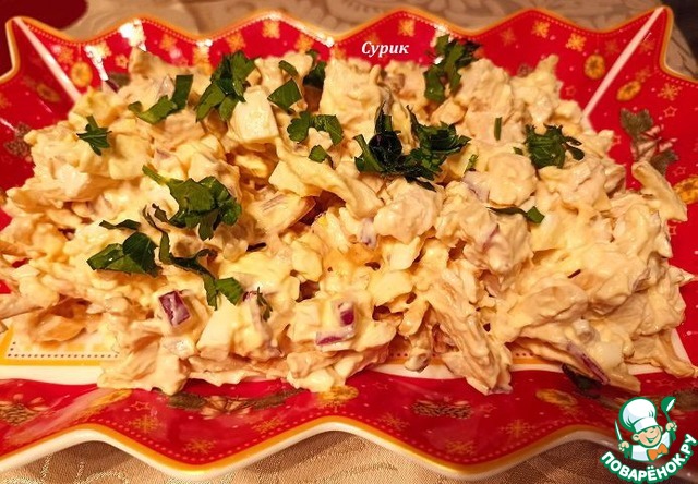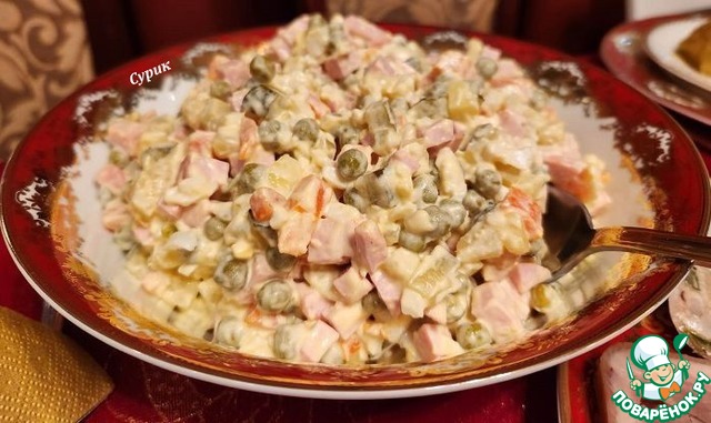 Вкусный салат! Горошек у меня из банки консервированный. И морковку добавила. Заправка интересная. Нам понравился салат.