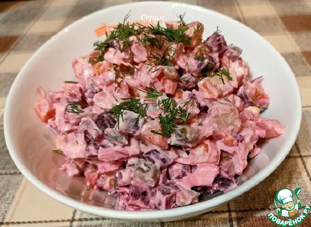Приготовила по этому рецепту. Слои так же как в рецепте. Но яйца окрасились в свекольный сок. Но… всё равно было очень вкусно! Любим мы этот салат!