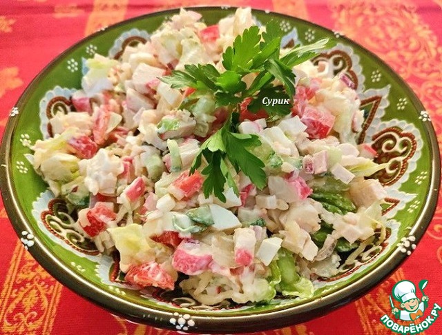 Очень вкусный салат! Для нас – новый вкус крабового салата, который нам очень понравился. Заправка тоже очень вкусная.