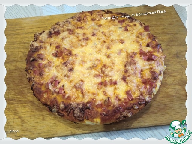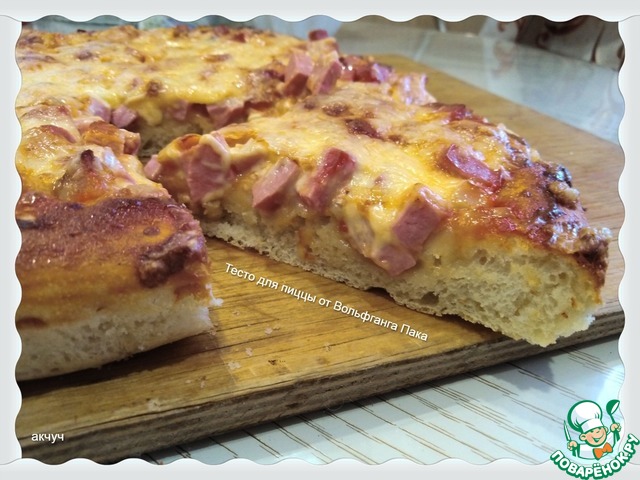 В выходные родные попросили приготовить пиццу. Рецепт был в КК, так что долго искать не пришлось. Тесто замечательное, нежное. За 1 час отлично подошло. Муки у меня ушло меньше (290 г), воду тоже взвесила (200 г). Брала большую, во всю высоту противня круглую форму, поэтому тесто вроде бы и легло тонким слоем, но очень хорошо выросло во время выпечки. Начинкой послужили остатки колбасы разного вида и сыр, верх теста смазывала смесью майонеза с кетчупом. Пекла 35 минут при 180 градусах. Получилось вкусно.