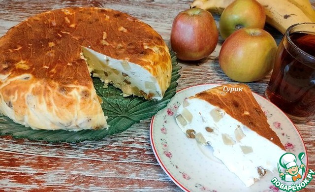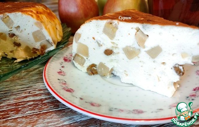 Вкусная запеканка! Нежная, воздушная. Я делала из творога 600 г., соответственно все продукты для массы увеличила в два раза. Но! Сахара меньше положила - изюм, банан – сладости было достаточно. И только 4 яйца. Творожная масса получилась великолепная! Яблоко одно, один банан (которые нарезала кубиками) и изюм – от души! Выпекала в мультиварке 1 час.