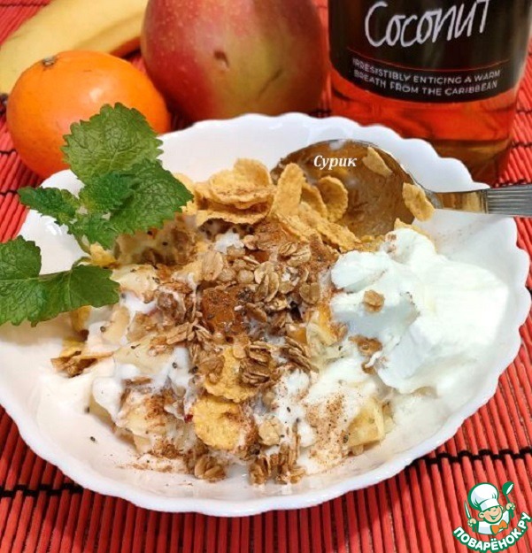 Замечательно начинать утро с такого великолепного завтрака! Необыкновенно вкусно! Йогурт я делаю сама. Из фруктов добавила яблоко, банан и мандарин. Мед и сок заменила на кокосовый сироп. Какой же получился аромат!!! В мюсли я добавляю ещё семена чиа. Да и ещё корица! И всё это вместе … очень и очень вкусно!