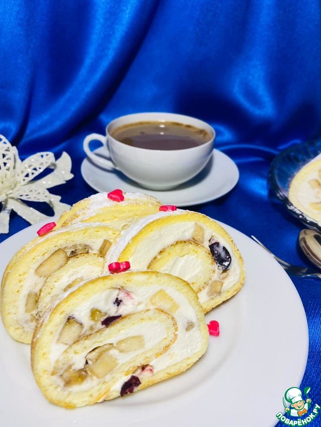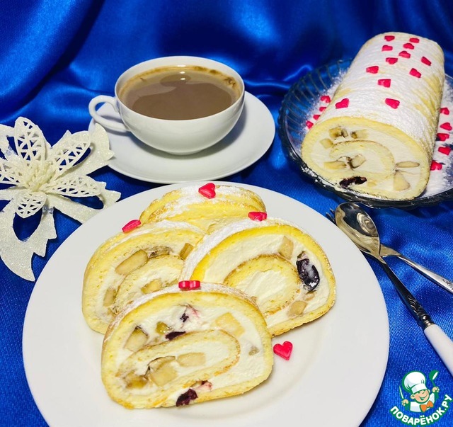 На НГ десерт необходим.но так как нужно было что то очень лёгкое выбор пал на этот рулетик.Готовила всё строго по рецепту.только в начинку ещё добавила орехи кешью..всё получилось великолепно и свернулось без проблем.И тут началось самое интересное...на ароматы прибежал муж