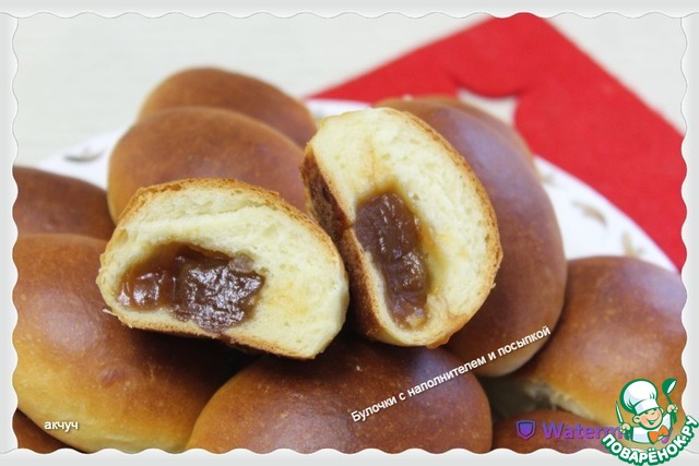 Пекла такие булочки в 2015 году. Тогда у меня тесто получилось жидковатое. Решила уже, так сказать, с опытом снова попробовать приготовить. За основу взяла стакан 250 мл. Муки ушло 2,5 стакана (чуть меньше 400 г). Тесто слегка совсем липло, но не стала больше забивать мукой. За 1,5 часа хорошо выросло. Получилось 19 штук. Мне нужна была штучная выпечка, поэтому лепила обычные пирожки. Верх смазала просто молоком. Но надо было все же сделать с посыпкой, это изюминка вкусовая. Выпекала 30 минут при 180 градусах. Для сладкой начинки (у меня яблочное повидло) можно уменьшить количеств сахара в тесте. Получились мягкие вкусные пирожки.
