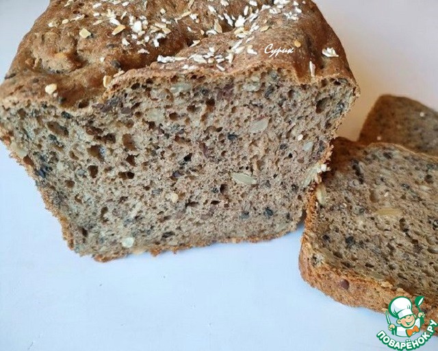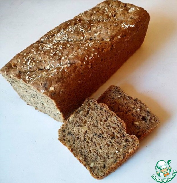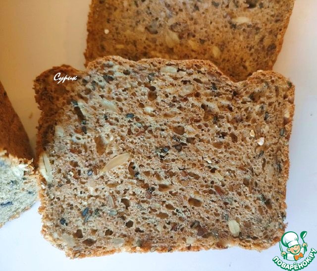 Хлеб получился очень и очень вкусный! Но, хлебом назвать это сложно. Скорее всего десертный хлеб. Что-то между хлебом и кексом. Это моё мнение, о вкусах не спорят. Получился плотный, тяжеленький, отлично нарезается. Очень вкусный и ароматный! Я добавила ещё смесь семян – кунжут белый и черный, семечки подсолнечные и тыквенные, семена льна. А с маслом и чаем или кофе… слов нет, очень и очень вкусно! Всё по рецепту: замес в ХП (30 мин.), выпекала в духовке 120 град. 1,5 часа, ставила в холодную духовку.