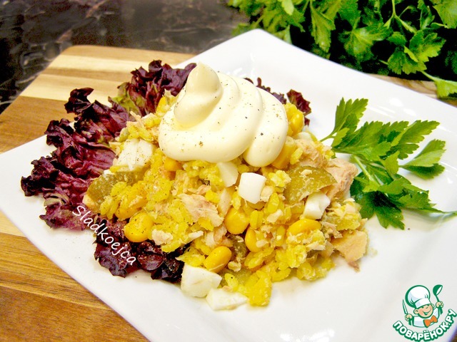 Люблю рыбные салатики, этот с тунцом. Но, у меня а-ля «Монреаль», так как с солеными огурцами (свежие неожиданно закончились). Порционно не стала делать, смешала все вместе. Вкус от этого не пострадал, салат понравился.