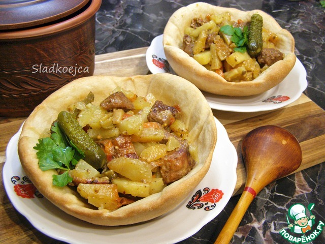 Рецепт подробный, все продумано до мелочей. Блюдо вышло сытное и вкусное. Готовила в одной большой глиняной кастрюле, подавала в съедобных хлебных тарелках (рецепт ниже). Вкусно и оригинально!