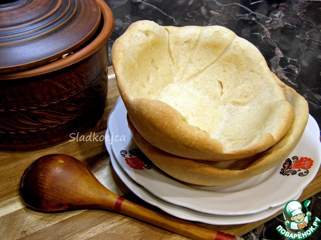 В составе теста есть манная крупа, тарелочки получаются пушистые и достаточно мягкие. Однако, не размокают (у меня, во всяком случае, не размокли). Сделала полпорции теста, получилось две таких немаленьких тарелки. Сырое тесто держит форму, с ним легко работать. Думаю, что его можно использовать и для крышек на горшочки, и для запекания мяса… Рецепт понравился, забираю себе на вечное пользование.