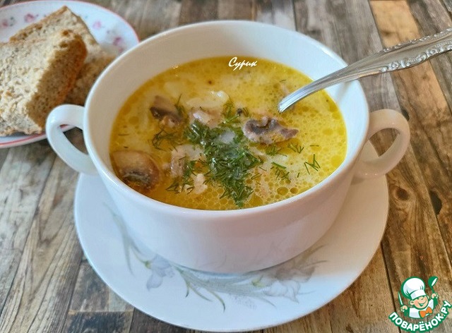 Замечательный суп! Быстро, просто, а результата очень порадовал! Сырно-грибной! Да ещё и с фаршем, у меня куриный. Грибы шампиньоны.