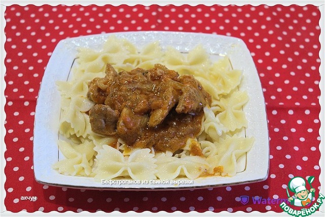 Наконец-то воспользовалась рецептом. У меня были куски свинины разного размера, как смогла нарезала. Вместо пасты брала томатный соус, остальное по рецепту. Получилось очень вкусное и сытное блюдо. Подавала с «бантиками».