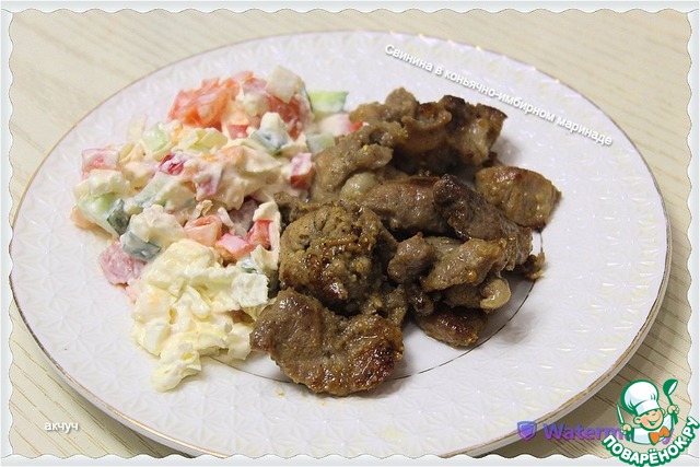 Я сразу решила, что буду резать мясо небольшими кусочками. Мариновала несколько часов, потом очень легко и быстро пожарила. Маринад почти весь впитался. Из изменений: чеснок и имбирь брала сухие, вместо лимонного сока яблочный уксус. Получилось вкусное сочное мясо. Коньяка я здесь не почувствовала, больше преобладал вкус горчицы (брала французскую).