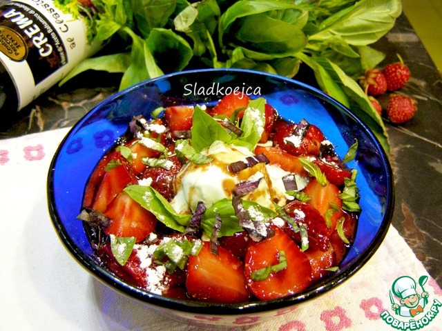 Это восхитительно вкусно!!! Ароматно, ярко, освежающе! Пряный базилик придает пикантности, а бальзамический соус очень украшает этот десерт. Рецепт забираю в КК, буду готовить еще не раз.