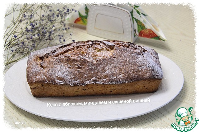 Так как мои родные не очень жалуют выпечку с яблоками, решила порезать яблочко мелким кубиком и все сразу добавить в само тесто. Остальное без изменений. Выпекала в силиконовой форме 55 минут при 180 градусах. Остывал кекс на решетке. Какой же вкусный получился! Словами не описать. Вкус миндаля и вкрапление вишневой кислинки!!! Яблочко не очень чувствуется, чего я и добивалась. Ооооочень вкусно получилось! Забираю рецепт в любимчики!