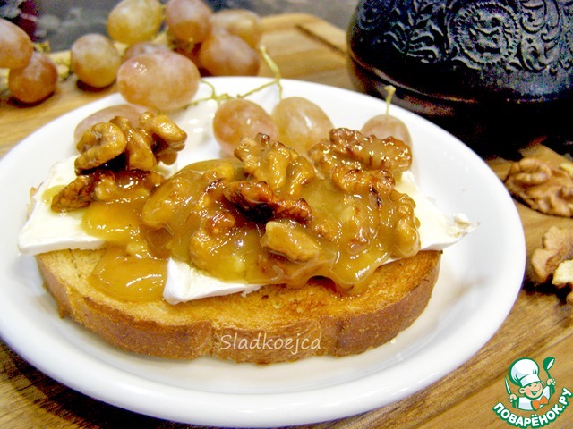 Очень вкусный бутерброд! Прекрасное сочетание бри и орехов в мягкой медовой карамели. Острый перец добавила молотый, кусочек белого батона предварительно немного подсушила на сковороде. Сочетание всей этой роскоши с горьким кофе – сплошной восторг!