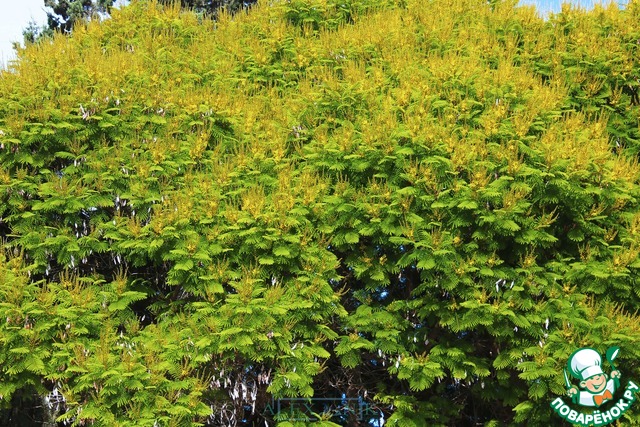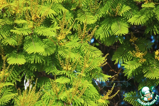 . Отсюда до "шалтит" уже рукой подать.Второе слово в названии дерева, "мекуметет" – "помятый" относится к внешнему виду лепестков цветка, которые, при ближайшем рассмотрении, действительно выглядят, как мятая салфетка: мягкая и приятная на ощупь. Сочетание этих слов "шалтит мекуметет" – звучит довольно странно. Что-то вроде "помятый герб", но первоначальное ивритское название дерева было ещё менее удобоваримо. Это была полная калька PELTOPHORUM DUBIUM - "шалтит месупекет" (שלטית מסופקת