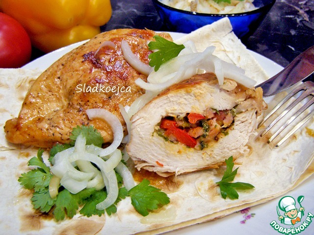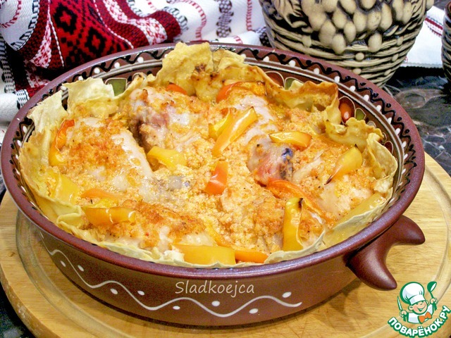 Давно хотела приготовить это блюдо, лаваш испекла специально для него. В соус из мацони, кроме болгарского перца, добавила молотую паприку. Курицу мариновала ночь. Получилась замечательная ароматная курочка, а лаваш в духовке пропитался соусом и был тоже очень вкусный