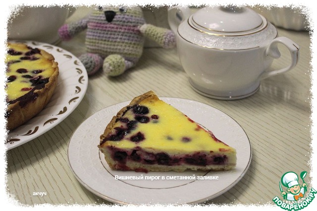 Вишни не было, использовала замороженную смородину, слега промыв в теплой воде. Далее все по рецепту. Выпекала 35 минут при 180 градусах. Остывал пирог в холодильнике. После охлаждения пирог легко вынула из формы, не крошился, отлично нарезался. Получилось вкусно и со смородиной.