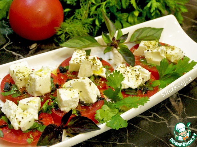 Прекрасная закуска! Ароматная, пряная, сочная! Сейчас лето, можно найти любую свежую зелень. Я нарубила базилик, петрушку, кинзу, добавила чеснок и посыпала помидоры. Аромат стоял потрясающий! Не стоит и говорить, как сюда вписалась пряная брынза
