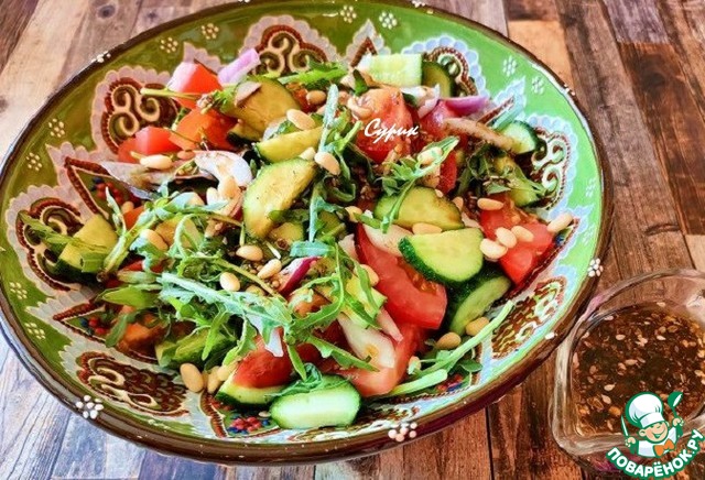 И правда – необычная заправка! Всё сделала по рецепту. Очень вкусная, ароматная! Салат получился необыкновенный! Очень понравился. И… послевкусие кедровых орешков! Ммм… супер!