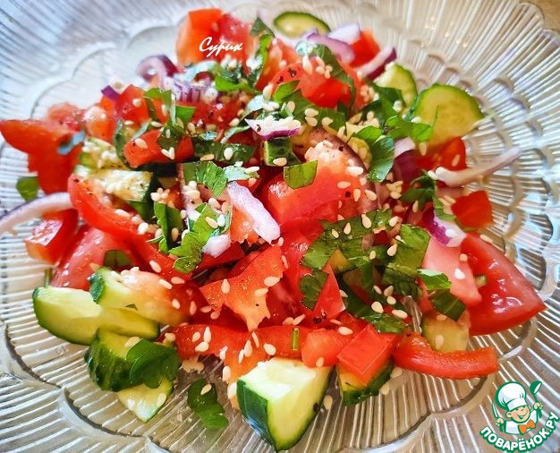 Замечательный салат! Очень вкусный! Кунжут здесь отлично вписался к овощам.