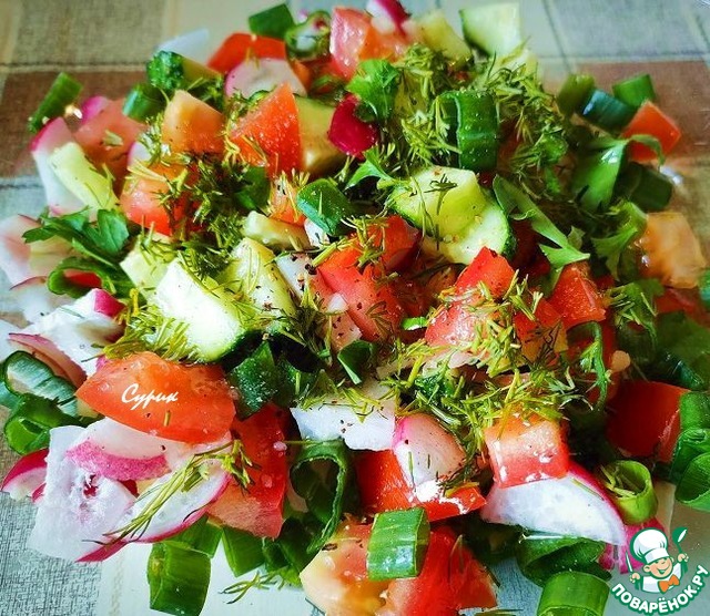Вкусный овощной салат. У меня без маслин, т.к. по рецепту это оформление салата.