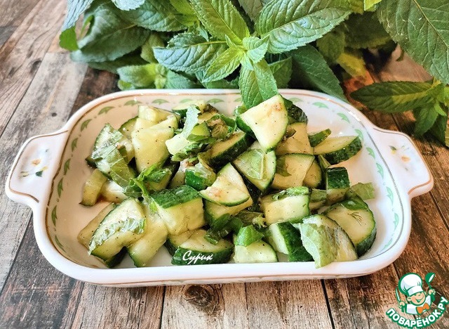 Отличный салат! Очень вкусный, ароматный! Отличная заправка. Мята замечательно сочетается с огурцами. Чеснок у меня свежий, ядреный!