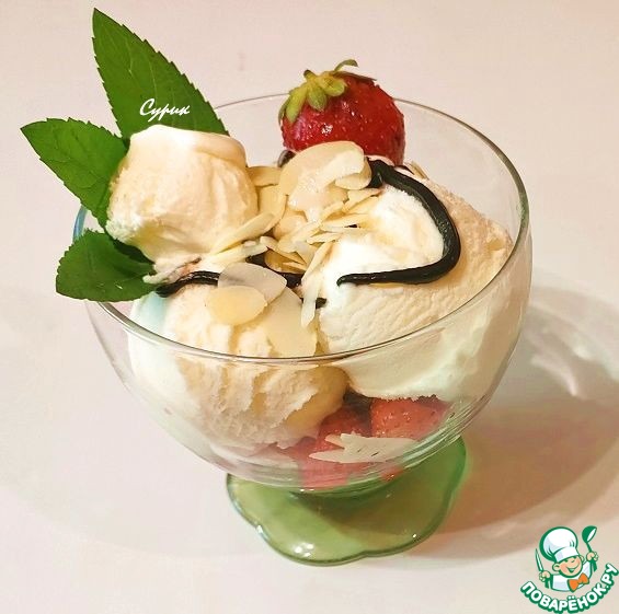 Вкусно, сладко, ароматно! Сахар не добавляла, пломбир и так сладкий. Сверху миндальные лепестки. Полила шоколадным топпингом.