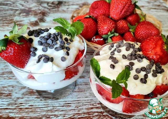 Этот десерт не может быть не вкусным! Безе, клубника и взбитые сливки!!! Необыкновенно вкусно! У меня были сливки 20 %, которые ну никак не хотели взбиваться. Взбились, но … не так, как хотелось бы. Поэтому я их поставила в морозилку на 30 мин. А затем уже насладилась этим великолепный вкусом!