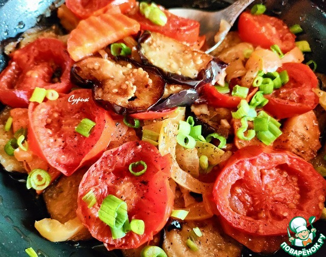 Очень вкусные получились баклажаны. У нас это был горячий гарнир. Помидоры просто нарезала, сейчас они мясистые с тонкой шкуркой. Поэтому использовала всё! Очень ароматно!