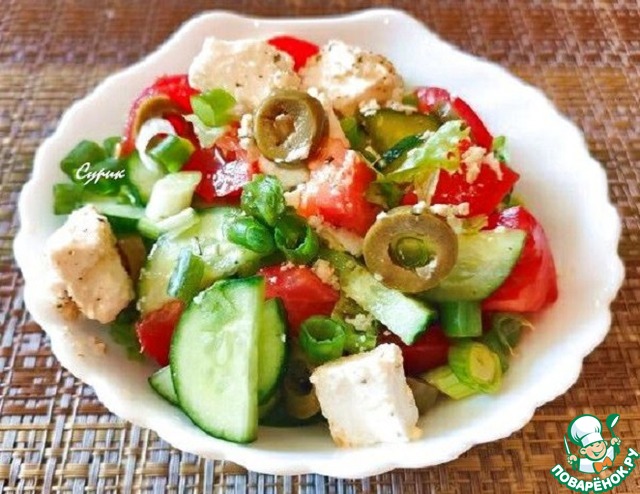 Вкусный ароматный овощной салат! С маринованным сыром… ну очень вкусно!