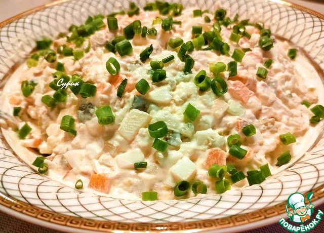 Вкусный салат! Разновидность «Оливье». Огурец добавила свежий.
