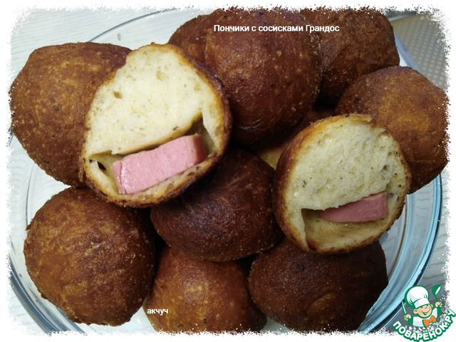 Я решила, что 12 штук для нас маловато будет, поэтому сразу увеличила норму. Муки ушло на 100 г меньше (для двойной нормы), базилика больше добавила. Да здесь со специями можно пофантазировать по своему вкусу. У меня оставалось две сосиски, пришлось их помельче порезать. В итоге, получилось 24 пончика. Очень вкусные, слегка упругие и воздушные одновременно. Вкус специй чувствуется, что мне понравилось.