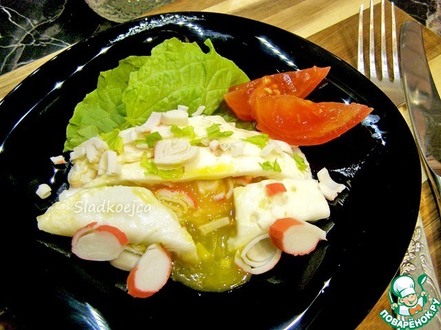 У блюда привлекательный вид и мне захотелось его попробовать. Получилось вкусно, на завтрак иногда можно приготовить. В начинку используются крабовые палочки, но я думаю, что с начинкой можно поэкспериментировать.