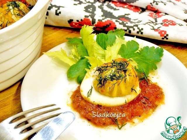 Интересное, сбалансированное по вкусу блюдо. Очень понравилось! Томатный соус хорошо сочетается с яйцами, придает пикантности. Соус готовила из домашних помидоров, консервированных в собственном соку. Перед запеканием немного посыпала тертым сыром. Отличный рецепт, очень рекомендую попробовать!