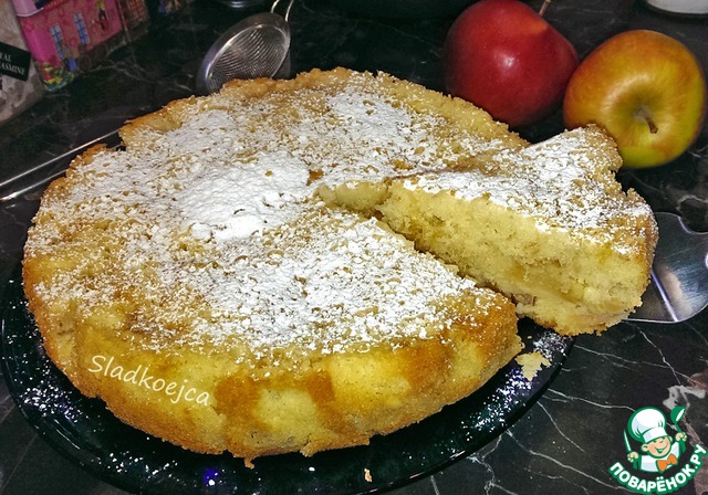 Пришла по следам Люды (Сурик). Хочу сказать большое спасибо автору за рецепт, а Людочке за наводку! Пирог нежнее нежного и очень вкусный! Немного отступила от рецепта, добавив изюм и кусочки лимона, т.к. яблоки были сладкие. И печь мне пришлось в мультиварке (духовка была занята). При максимальной Т=130*С на режиме «выпечка», ушло 1 час 35 мин. По вкусу получилось восхитительно, только верх не румяный.