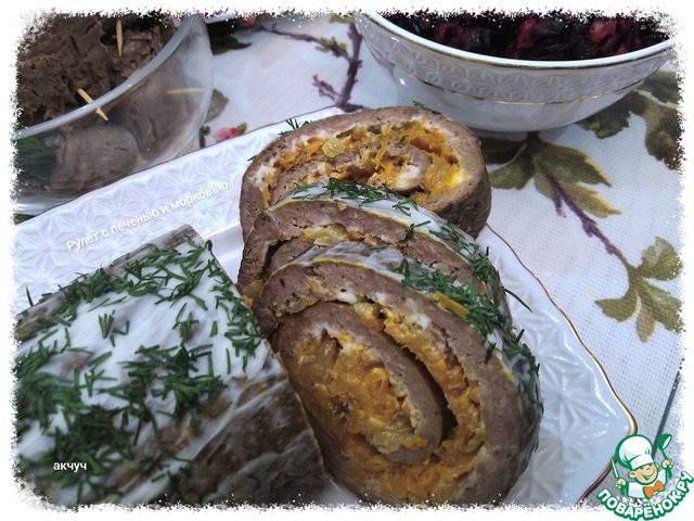 Мои дети очень любят печеночный торт и вот решила приготовить такой рулет. 1 яйцо заменила на молоко, добавила чеснок, из специй соль и перец. Выпекала 20 минут при 180 градусах. Хоть я и очень хорошо смазала пергамент маслом, сложновато было снять тонкий слой печенки с листа, но я справилась. Далее никаких сложностей. Получилось ожидаемо вкусно. И очень нарядно!