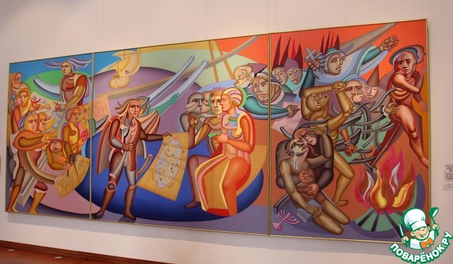Этот триптих "Открытие Америки" был создан по специальному заказу основателя музея Гарри Реканати у мексиканского художника еврейского происхождения Арнольда Белкина, которого также называют последним великим мастером монументальной живописи в Мексике, с целью увековечить 1492 – год открытия Америки, изгнания евреев из Испании и инквизиции.