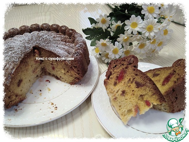 Я готовила половину нормы. Обошлась без цедры, арахис не измельчала, остальное по рецепту. Выпекала 40 минут при 180 градусах. Верх кекса сильно вырос и лопнул. Пришлось срезать для устойчивости (я кекс перевернула вверх ногами). Получилось очень вкусно.