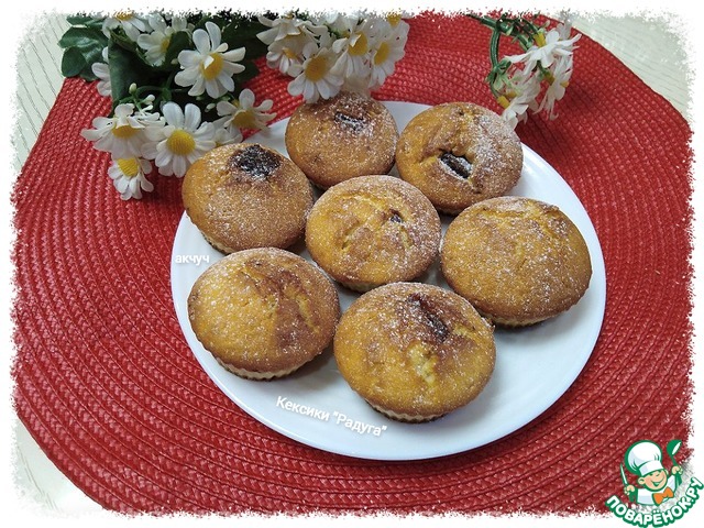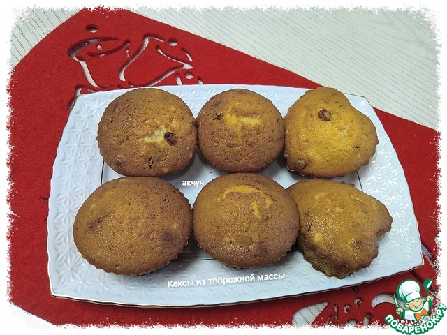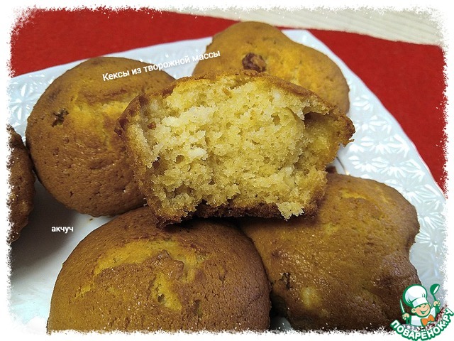 У меня был творог крупинками, поэтому добавила для однородности остатки смеси от приготовления гренок (молоко, сахар, яйцо) и изюм. Стакан использовала 200 мл. Выпекала 22 минуты при 180 градусах. Ах, какой стоял аромат! Я бы сказала медовый! А результат превзошел все ожидания. Необыкновенно мягкие, вкуснющие кексики!