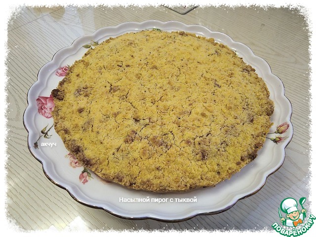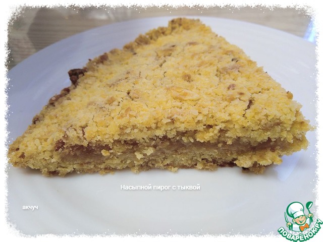 Давно не пекла насыпные пироги. Решила исправиться. Начинка была готовая (джем из кабачка и апельсина). И форма была в диаметре 24 см. Пекла 45 минут при 180 градусах. Пирог вышел невысоким, но вкусным.