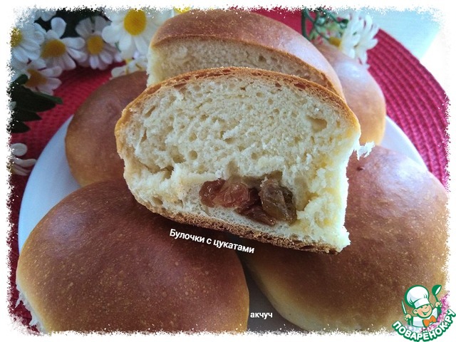 Давно заприметила рецепт. Уж очень булочки красивые у автора. Муки ушло чуть меньше (675 г), вместо цукатов брала изюм. Всего налепила 20 булочек, как раз на один большой противень. Поторопилась разделывать булочки и забыла добавить изюм. Пришлось его как начинку использовать. Перед выпечкой дала булочкам отдохнуть 20 минут, потом смазала молоком и выпекала 25 минут при 180 градусах. Резала булочку еще теплой. Получилось вкусно, но в следующий раз, наверное, добавлю больше соли. Ну и постараюсь уже без ляпов.